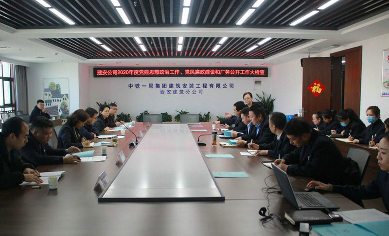 (西安訊)1月13日,由中鐵一局建安公司工會主席王淑娟帶隊、黨委辦公室、人力資源部、紀委、黨委宣傳部、群團工作部一行6人組成的黨建思想政治工作檢查組到西安建筑分公司開展2020年度黨建思想政治工作、黨風廉政建設及廠務公開工作檢查考核。西安建筑分公司經理白濤、黨總支書記劉改民及班子成員、各部室負責人參會。