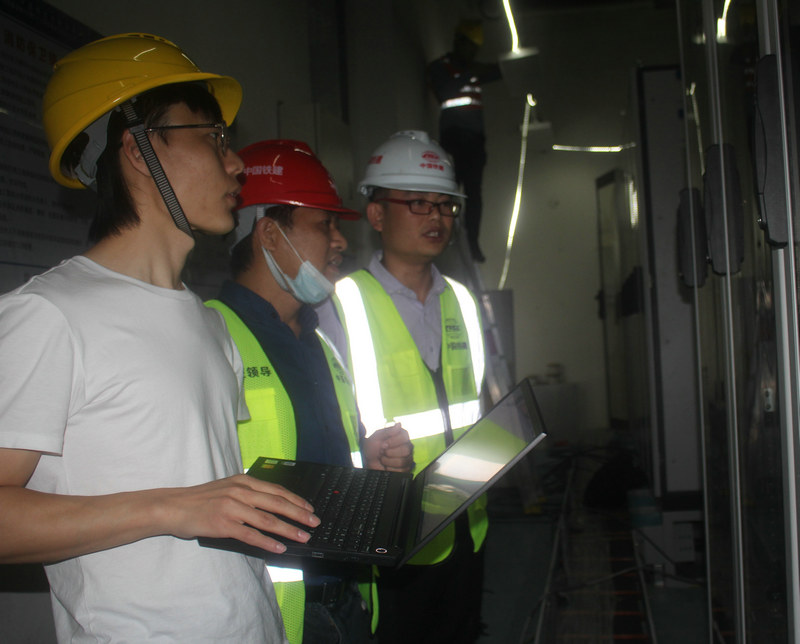 五工區(qū)副經(jīng)理、質(zhì)量總監(jiān)李毅(左2)在番禺廣場站機房檢查設備