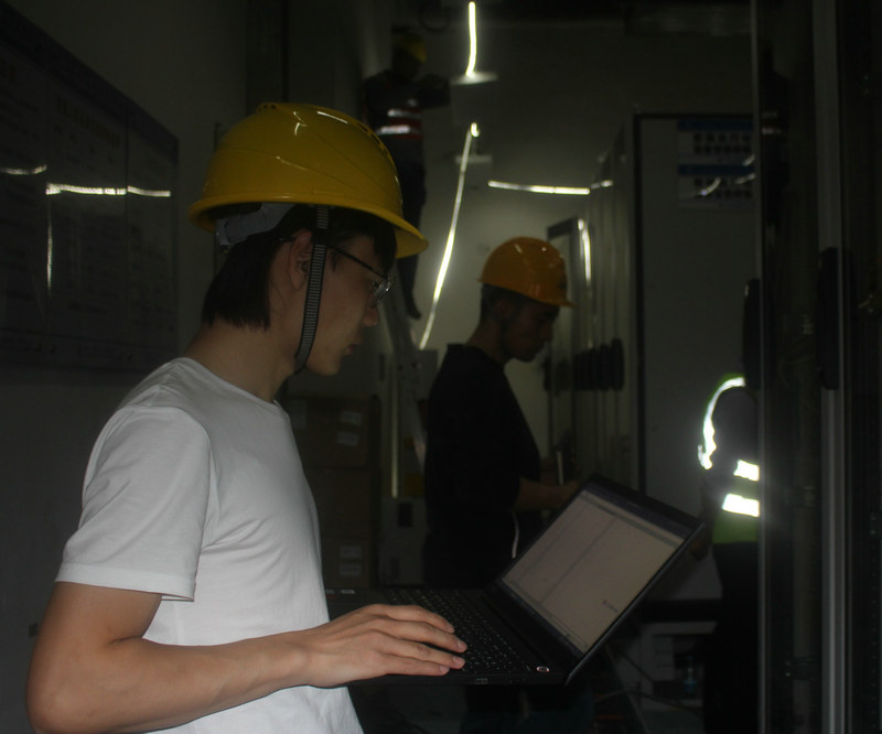 五工區(qū)技術(shù)人員在番禺廣場(chǎng)站機(jī)房調(diào)試設(shè)備