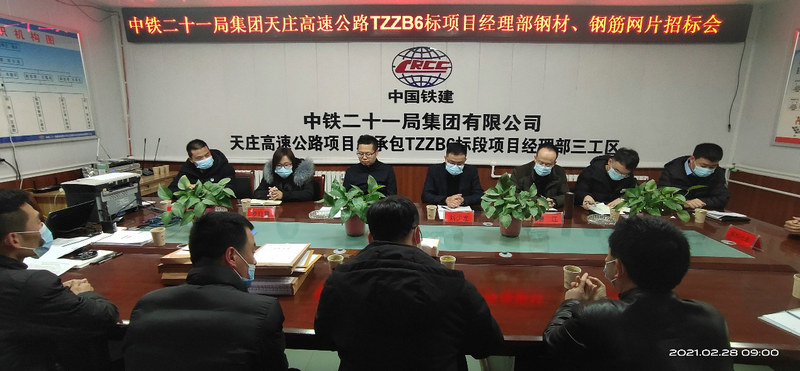 2月28日, 中鐵二十一局四公司天莊高速公路項目部組織召開了鋼材、鋼筋網(wǎng)片物資采購招標會,本次招標共分為2個包件,鋼材、鋼筋網(wǎng)片各一個包件,共有6家單位參與了本次招標會。甘肅省公航旅天莊項目公司紀檢科的領(lǐng)導、天莊項目3標監(jiān)理試驗室主任、公司總部物資設(shè)備部部長、項目部全體領(lǐng)導及相關(guān)工作人員參加了招標會。