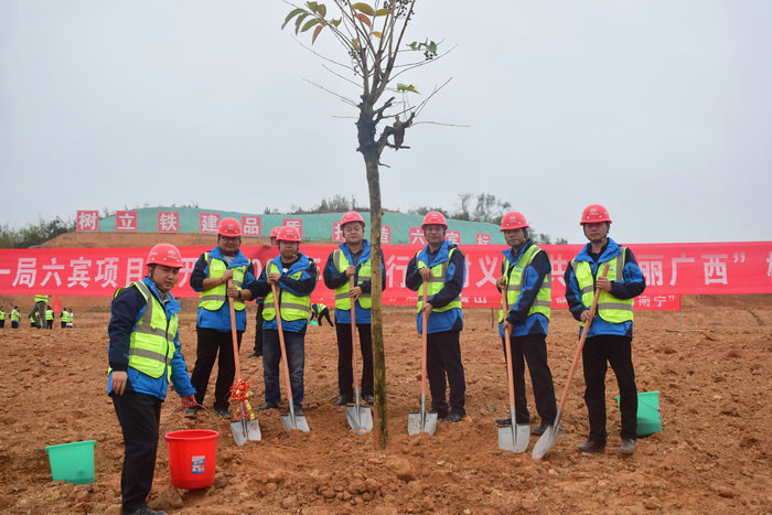 本網(wǎng)廣西南寧3月15日訊(通訊員 龍凡 蔡曉菲)3月12日上午,為迎接中國共產(chǎn)黨100周年華誕,踐行習(xí)總書記“廣西生態(tài)優(yōu)勢金不換”“綠水青山就是金山銀山”的綠色發(fā)展理念,南寧交投集團、中鐵建北部灣集團、六賓高速公司、六賓總包部以及六賓高速各標(biāo)段在中鐵二十一局六賓項目部所屬陳平互通施工現(xiàn)場開展“致敬黨的百年華誕,打造綠色生態(tài)六賓”義務(wù)植樹活動,讓六賓高速建設(shè)為廣西綠水青山添彩。