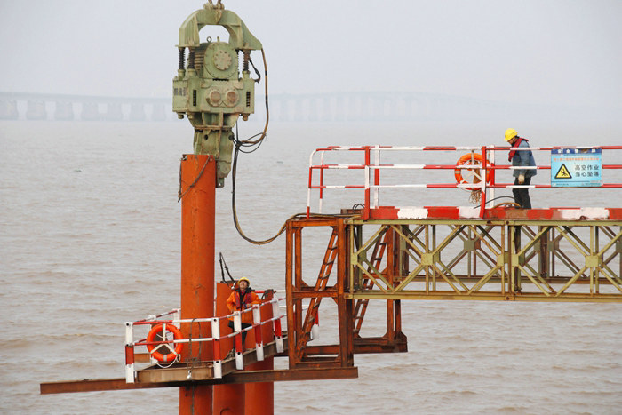 為了保證濱海高架和濱?;ネㄊ┕さ捻樌M行,要搭設(shè)一座6.5米高、8米寬、大于大橋里程的鋼棧橋,方可滿足上百臺機械設(shè)備橋上打樁、運輸、堆放數(shù)量龐大的工程物資。在施工中,項目部采取棧橋現(xiàn)行,樁基、承臺、墩身緊隨的策略,在措施上贏得先機,掌握主動。并根據(jù)施工需要,挑選4家海上施工經(jīng)驗豐富、鋼材自給自足的鋼棧橋施工隊進場作業(yè)。在項目部通力協(xié)調(diào)組織下,各施工隊配合默契,與2020年9月1日在兩座橋的多個點正式點燃鋼棧橋施工大戰(zhàn)烽煙,掀起海上大干高潮。多臺履帶吊在人力配合下,懸掛兩噸多的振動錘,以20多噸的壓力向下插打直徑0.66米的鋼管,將鋼管穿透海底淤泥層,直至36米深的膠泥或沙土層為止。流水作業(yè)工序環(huán)環(huán)相扣、有條不紊。插入海底泥土中的鋼管,由3段鋼管無縫對接,再用圓鋼管、角鋼、工字鋼分層焊接起來,再在上面安裝貝雷梁,鋪設(shè)一層抗壓力很強的厚鋼板,周邊安裝1.2米高的鋼管防護欄。
