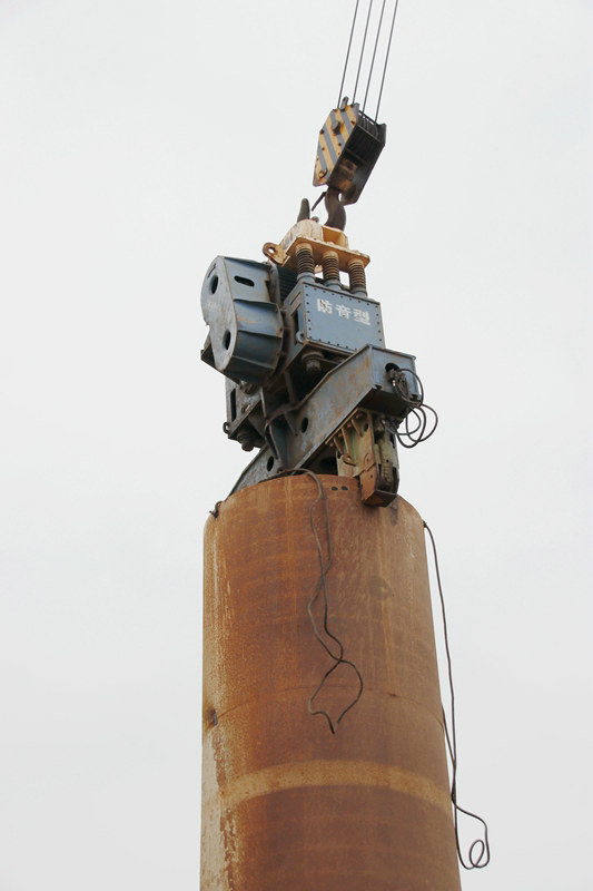 在樁基施工中,樁基隊(duì)在技術(shù)人員指導(dǎo)下,將位于棧橋作業(yè)平臺(tái)樁基位置切割成標(biāo)準(zhǔn)的圓形窟窿,然后操縱履帶吊,由自重10多噸的振動(dòng)錘“咬住”鋼護(hù)筒向下插打,每12米一截,打下一截再焊接一截,依次推進(jìn)。在打插過(guò)程中若有偏移,馬上矯正,確保打入海底98米位置的鋼護(hù)筒準(zhǔn)確無(wú)誤。鋼護(hù)筒完成后,由樁基隊(duì)進(jìn)行泥漿反循環(huán)鉆孔作業(yè),這道工序完成后,為后續(xù)沉降鋼筋籠、灌注混凝土、焊接牛腿、安裝底板、破樁、承臺(tái)和墩身施工創(chuàng)造了條件。