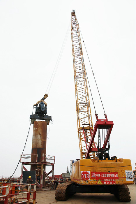 在做好前提準(zhǔn)備工作的同時(shí),該項(xiàng)目部進(jìn)行搭設(shè)棧橋作業(yè),只有搭設(shè)好棧橋,具備了條件,方可投入樁基施工。于是幾個(gè)棧橋隊(duì)緊鑼密鼓地不分晝夜地打樁、焊接、安裝棧橋。項(xiàng)目部又接著通過(guò)公開(kāi)招標(biāo)形式,錄用4支樁基隊(duì)投入施工。在樁基施工中,樁基隊(duì)在技術(shù)人員指導(dǎo)下,將位于棧橋作業(yè)平臺(tái)樁基位置切割成標(biāo)準(zhǔn)的圓形窟窿,然后操縱履帶吊,由自重10多噸的振動(dòng)錘“咬住”厚度為1.2厘米的鋼護(hù)筒向下振插,每12米一截,打下一截再焊接另一截,依次推進(jìn)。在打插過(guò)程中若有偏移,馬上矯正,確保打入海底98米位置的鋼護(hù)筒準(zhǔn)確無(wú)誤。鋼護(hù)筒完成后,由樁基隊(duì)進(jìn)行泥漿反循環(huán)鉆孔作業(yè)。鉆孔施工可不簡(jiǎn)單,進(jìn)場(chǎng)鉆頭鉆到堅(jiān)硬巖層,上面只見(jiàn)連接管旋轉(zhuǎn),半天不見(jiàn)進(jìn)尺,著急也沒(méi)用,沒(méi)有更好的辦法,只能耐心地等,直到鉆到98米深才罷休。