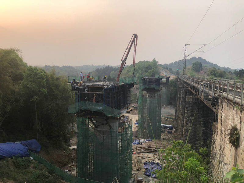 圖為成渝線K137+055龍馬河大橋重建工程3號(hào)墩0#塊混凝土澆筑現(xiàn)場(chǎng)