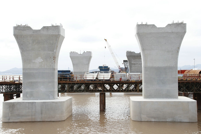 鐵路工程建設網(wǎng)訊(特約通訊員呂奎元)截至5月11日,經(jīng)過中鐵十五局集團廣大職工辛勤努力,杭甬高速復線寧波段一期S3合同段110座挺拔的橋墩魏然屹立于海上,主體工程完成過半。該項目傲然挺立于海上的110座高度為12米左右的橋墩,成為是一道亮麗的風景線,吸引了前來檢查指導工作的業(yè)主、監(jiān)理的目光,對親手建造橋墩的