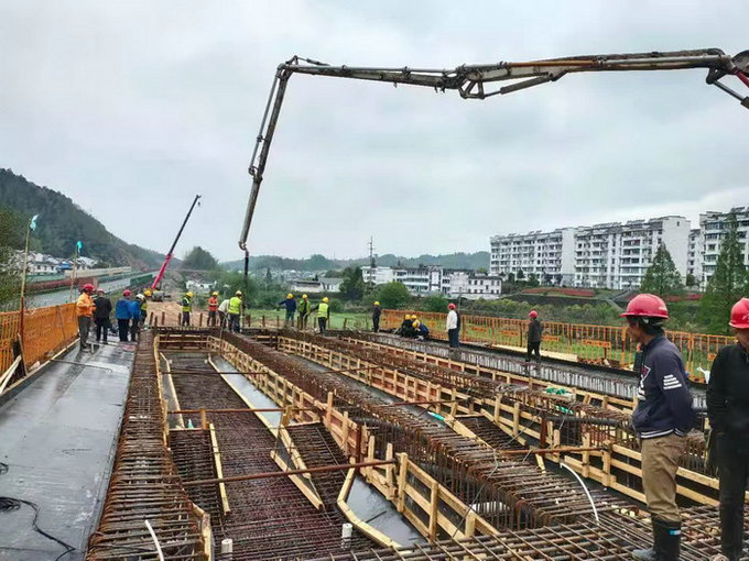 圖為現(xiàn)澆梁施工準(zhǔn)備工作就緒 施工中,參建員工,搶抓施工大好天氣,以開展“秦渭杯”勞動(dòng)競賽活動(dòng)為契機(jī),搶晴天,戰(zhàn)雨天,加班加點(diǎn),不分晝夜,各包保值班領(lǐng)導(dǎo)和技術(shù)人員,明確分工,責(zé)任到人,總工、安全總監(jiān)“零距離”現(xiàn)場(chǎng)監(jiān)督,旁站指導(dǎo),下沉現(xiàn)場(chǎng),及時(shí)解決突發(fā)問題,為施工節(jié)點(diǎn)完成提供可靠保障。在澆筑過程中,精心計(jì)算支模梁體兩側(cè)混凝土重量和受力分布,加大做好隱弊部位工程質(zhì)量檢查力度,確保每根鋼筋、每一個(gè)預(yù)埋件、每一塊墊板安裝準(zhǔn)確到位。在震搗過程中,抽調(diào)經(jīng)驗(yàn)豐富的工人擔(dān)負(fù)震搗手,保證砼內(nèi)實(shí)外美,表面平整光滑。在連續(xù)澆筑時(shí),施工人員兩班倒,為把節(jié)點(diǎn)任務(wù)時(shí)間往前趕,參建人員現(xiàn)場(chǎng)吃方便面,連續(xù)奮戰(zhàn)72小時(shí)不間斷,遇到陰雨天氣披上雨衣,不畏辛苦,表現(xiàn)出了連續(xù)作戰(zhàn)的工作作風(fēng)。