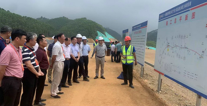 圖為南寧市政協(xié)領(lǐng)導聽取工程情況介紹 陳平互通距賓陽南樞紐立交14.49公里,主要工程包括:主線橋梁三座、匝道橋梁四座,共計全長1792米;涵洞四座;土石方挖方237.7萬方;土石方填方208.8萬方。設(shè)置一處收費站,收費站規(guī)模2進2出。工程概算總造價3.23億元。2020年8月15日開工。目前路基、橋梁樁基基本完成,橋梁墩柱和預(yù)制梁片施工正全面展開。開工累計完成投資2.68萬元,占總投資82.9%。