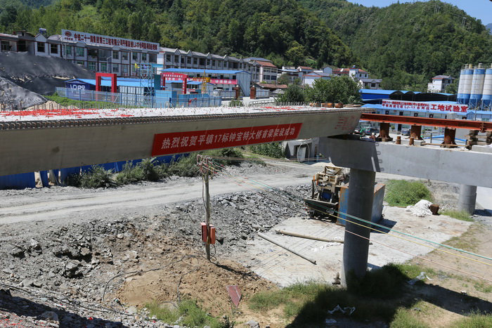 上午11時18分,天空艷陽高照,南江河兩岸一片翠綠的山體被映襯得格外美麗。當長30米,重約80噸的箱梁在架橋機牽引下,即將落在58號橋臺和57號橋墩上時,現(xiàn)場喜慶的禮花沖天而起,爆竹聲響成一片,慶祝鐘寶特大橋首片箱梁架設(shè)成功。