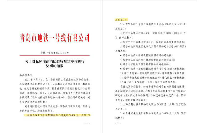 在“關于對瓦屋莊站消防驗收參建單位進行獎罰的通報”“關于對列車自主運行系統(tǒng)(TACS)1號線測試項目相關參建單位的表揚通報”中,青島市地鐵一號線有限公司高度贊揚了中鐵武漢電氣化局作為參建單位積極響號召,精細組織,高質(zhì)量完成各項工作。