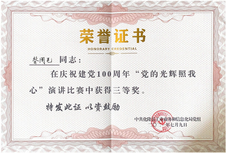 近日,中鐵二十一局四公司青海分公司化隆砂石廠受邀參加化隆縣工業(yè)商務(wù)和信息化局黨組慶祝建黨100周年“黨的光輝照我心”演講比賽,參賽代表榮獲三等獎(jiǎng)。