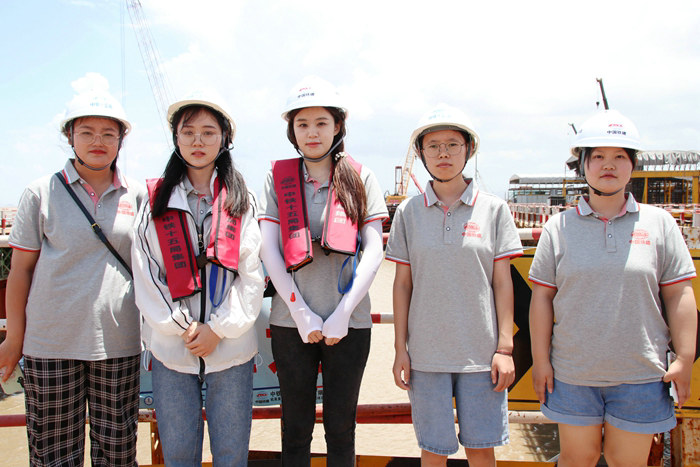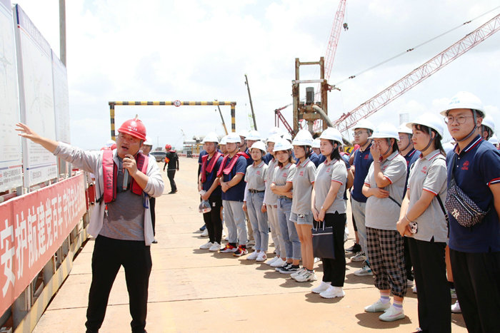 隨后,組織大學(xué)生到濱?;ネê蜑I海高架觀摩。當(dāng)大巴車(chē)載著學(xué)生們進(jìn)入施工現(xiàn)場(chǎng)的時(shí)候,他們被海上兩座大橋雄偉壯觀的場(chǎng)景深深地吸引,紛紛舉起手機(jī)拍照。該項(xiàng)目副經(jīng)理喬繼保向大學(xué)生介紹了項(xiàng)目的安全質(zhì)量、進(jìn)度產(chǎn)值,以及工程進(jìn)展情況。