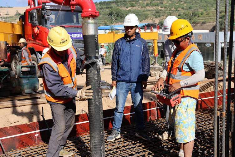 杜家溝大橋2#主墩承臺(tái)混凝土澆筑采用兩臺(tái)泵車同時(shí)施工,在澆筑過(guò)程中,以定人定崗晝夜兩班倒的方式進(jìn)行全過(guò)程盯控。為確保施工質(zhì)量,項(xiàng)目部超前謀劃、科學(xué)部署,根據(jù)施工現(xiàn)場(chǎng)的實(shí)際情況,優(yōu)化施工方案,排查安全隱患,混凝土溫度過(guò)程控制采用智能溫度實(shí)時(shí)檢測(cè)系統(tǒng),確保大體積混凝土強(qiáng)度達(dá)到設(shè)計(jì)要求。