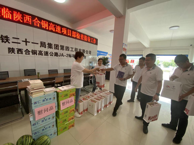 盛夏七月,驕陽似火。7月21日,中鐵二十一局四公司副總經(jīng)理、總會計師許海英,總部工會工作部人員走進陜西合銅高速JA-2標項目部為一線職工送去了戶外鞋、飲料、西瓜等防暑用品和書籍。