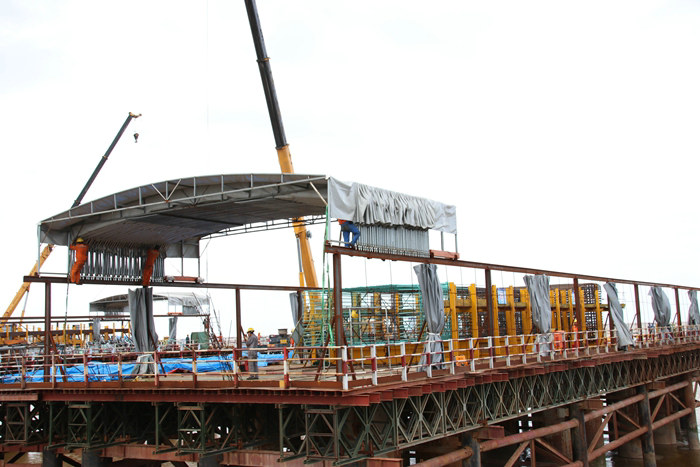 小型車輛全部撤離現(xiàn)場,40多臺履帶吊、起重汽車吊的大臂全部落地,棧橋上加工鋼筋籠的5個大棚擋風、擋雨、遮陽簾子收緊捆綁好,高空懸掛的各種宣傳標語牌暫時摘除,并將安裝就位的鋼筋籠,以及配電箱等加固好。與此同時,備足了沙袋、繩索等救災物資。其次,該項目部教育員工從心理上、思想上高度重視來勢兇猛的臺風,不能掉以輕心,要保持高度警惕性,以防萬一。
