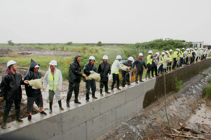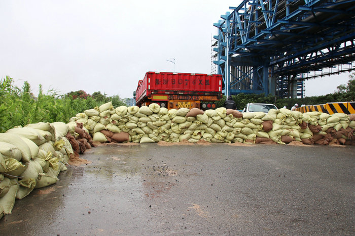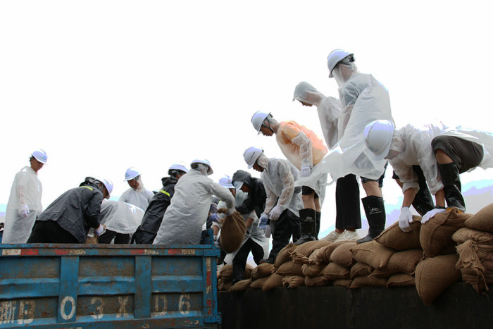 23日,杭甬項(xiàng)目部接到寧波市鎮(zhèn)海區(qū)和杭甬復(fù)線寧波一期高速公路有限公司防臺風(fēng)搶險(xiǎn)加固海堤的緊急任務(wù)后,立即組建了一支200人的搶險(xiǎn)隊(duì)伍,并購置了雨鞋、雨衣、安全帽、礦泉水等一批搶險(xiǎn)物資,為完成好寧波市鎮(zhèn)海區(qū)抗臺風(fēng)加固海堤搶險(xiǎn)任務(wù)作了組織上和物資上的準(zhǔn)備。24日上午10點(diǎn),該項(xiàng)目部班子成員冒著狂風(fēng)暴雨帶領(lǐng)搶險(xiǎn)人員兵分三路,一路人馬在一個(gè)砂石料場裝沙袋,另兩路人馬開赴位于臨近石化區(qū)域的兩處海堤位置往堤壩上堆碼沙袋。裝沙袋的一路人馬,兩人一組,一個(gè)人張開蛇皮袋口子,一個(gè)人快速地將一鍬鍬沙子裝進(jìn)袋子里,裝好一袋,合力扔到車上,風(fēng)越刮越大,大雨如注,干活的人卻一刻也不停。員工們在只有50厘米寬、約2米高的海堤上堆碼沙袋,稍不留神會掉進(jìn)淤泥形成的沼澤里。大風(fēng)吹開了他們胸前的雨衣扣,雨水直接飄到衣服上,誰也顧不上理會,只為早點(diǎn)將低矮的堤壩加高,抵御臺風(fēng)掀起的大潮,使化工區(qū)免遭洪澇災(zāi)害。