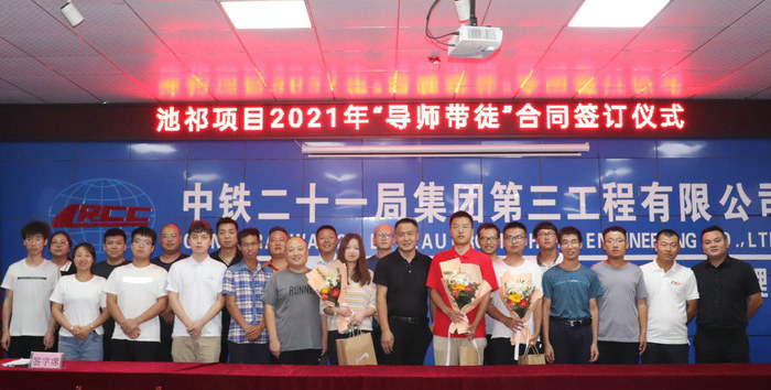 圖為導師帶徒簽字儀式 座談會上,項目經(jīng)理張一平代表全體參建員工對新學員入職表示熱烈歡迎,你們的到來為項目注入了新鮮血液,增添了發(fā)展的后勁與活力,并勉勵新學員盡快完成從學生到企業(yè)員工的角色轉變,早日融入項目新的群體之中,規(guī)劃好人生目標,樹立遠大志向,敢于擔當。并詳細介紹了公司的發(fā)展史,講述了鐵道兵的光輝歷史以及鐵道兵在抗美援朝的戰(zhàn)爭年代英勇頑強、不畏犧牲、不畏艱苦、可歌可泣的動人故事。在和平年代參加鐵路建設的偉大壯舉和不朽業(yè)績,要求把發(fā)揚鐵道兵的光榮傳統(tǒng)和鐵道兵精神一代代傳承下去。