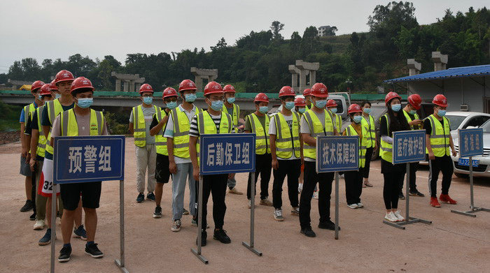 圖為列隊參加防汛應(yīng)急演練 本次演練背景設(shè)定為汛期連日降雨,巡查人員在巡查宏安壩大橋施工現(xiàn)場時,發(fā)現(xiàn)中都河水位急劇上漲,河岸錐坡塌陷,洪水漫過河堤淹沒了橋臺工程施工的物資設(shè)備,情況萬分緊急。巡查人員將汛情上項目部監(jiān)控中心后,立即啟動防汛應(yīng)急預(yù)案,迅速組織項目部人員、物資、機械聯(lián)合相關(guān)部門進行搶險救災(zāi)工作部署。