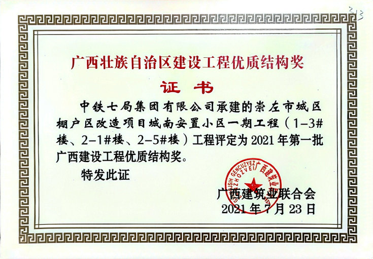 近日,中鐵七局四公司崇左棚改項(xiàng)目部喜獲2021年第一批廣西壯族自治區(qū)建設(shè)工程優(yōu)質(zhì)結(jié)構(gòu)獎(jiǎng)。