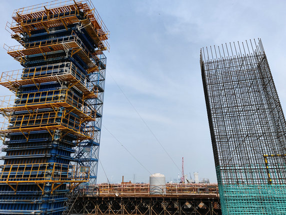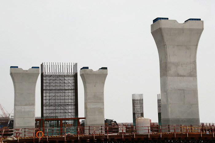 樁基是橋墩結(jié)構(gòu)的重要組成部分,承載著承臺(tái)和墩身的巨大壓力。濱海高架和濱?;ネǖ靥帨\海水域,水下地質(zhì)復(fù)雜,其中濱海高架橋跨越直徑4.5米的輸油管道等17條管線,給施工帶來(lái)很大難度。為此,2019年8月份開工以來(lái),該項(xiàng)目部制定了科學(xué)、合理、實(shí)用的下部結(jié)構(gòu)施工方案,采取蛙人潛水摸排、對(duì)照?qǐng)D紙準(zhǔn)確定位,以及鋼棧橋和作業(yè)平臺(tái)先行策略,為打插鋼護(hù)筒、鉆機(jī)鉆孔泥漿反循環(huán)、下鋼筋籠、灌注混凝土創(chuàng)造了極好條件。為了加快水下樁基施工進(jìn)度,該項(xiàng)目部選擇舟山一家加工鋼護(hù)筒的廠家,將大型全自動(dòng)智能設(shè)備運(yùn)至“大臨”大棚,并購(gòu)置厚度為1.2厘米的鋼卷板生產(chǎn)鋼護(hù)筒,然后將加工好的鋼護(hù)筒運(yùn)往施工現(xiàn)場(chǎng),每天可生產(chǎn)直徑1.8米—2.5米、20多米長(zhǎng)的鋼護(hù)筒4根左右,完全滿足了施工需要。同時(shí)采取公開招標(biāo)的形式錄用海上樁基施工經(jīng)驗(yàn)豐富的隊(duì)伍進(jìn)場(chǎng)負(fù)責(zé)樁基施工。在安全防護(hù)措施到位的前提下,由打樁專用的履帶吊、振動(dòng)錘與人力密切配合,打插一根根樁基。待鋼護(hù)筒打插到海下指定位置,進(jìn)行鉆孔泥漿反循環(huán)作業(yè),一道道工序如流水作業(yè),環(huán)環(huán)相扣,上道工序完成后馬上進(jìn)入下道工序,晝夜連續(xù)施工。該項(xiàng)目部建立班子成員、部門負(fù)責(zé)人和技術(shù)人員24小時(shí)值班制度,輪流在現(xiàn)場(chǎng)指導(dǎo),解決難題,為加快施工進(jìn)度,確保安全質(zhì)量提供了堅(jiān)強(qiáng)保證。中鐵十五局集團(tuán)二公司杭甬項(xiàng)目部呂奎元