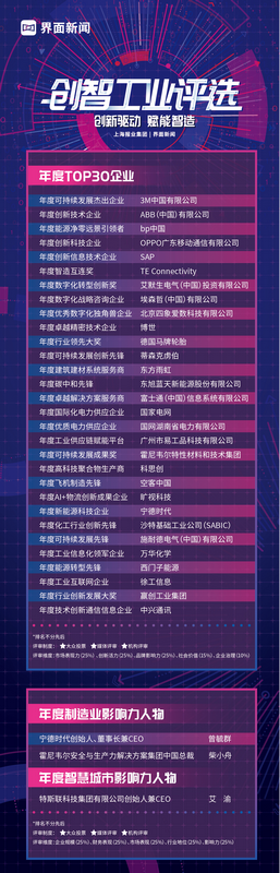 2021【界面創(chuàng)智工業(yè)論壇】作為中國工博會官方重點活動之一,以“創(chuàng)新驅(qū)動,賦能智造”為主題,聚焦產(chǎn)業(yè)數(shù)字化升級、“碳中和”愿景下的低碳轉(zhuǎn)型、企業(yè)創(chuàng)新戰(zhàn)略深化等議題,深挖綠色經(jīng)濟(jì)、智能制造、智慧城市等產(chǎn)業(yè)熱點。本次評選自3月啟動以來,綜合桌面調(diào)研、數(shù)據(jù)篩選、自主申報、媒體評審、機(jī)構(gòu)評審及大眾投票的結(jié)果,最終超過200家企業(yè)進(jìn)入候選池。終審階段,專家組從市場表現(xiàn)、業(yè)務(wù)標(biāo)準(zhǔn)、創(chuàng)新活力、社會價值、企業(yè)治理等多維度全方位進(jìn)行評分,最終30家企業(yè)、3位影響力人物脫穎而出,榮獲大獎。
