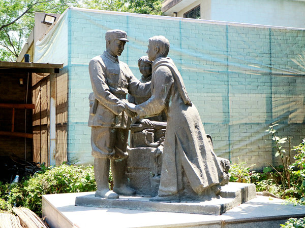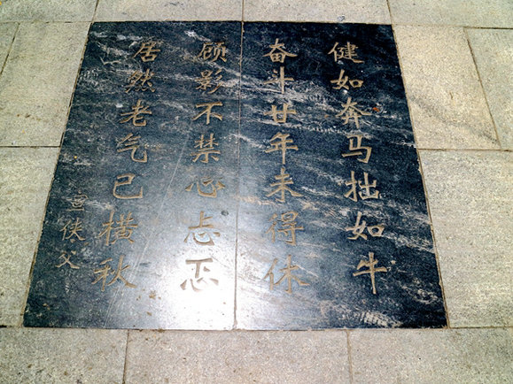 我們?nèi)サ哪翘欤檬前艘唤ㄜ娋攀闹苣?。這天,雖然第二、四、五、七號等院的外門未開,但里面相通。在院門外的廣場地面上有宣俠父生前曾在自己的照片背面寫下一首詩的碑刻,即:“健如奔馬拙如牛,奮斗廿年未得休。顧影不禁心忐忑,居然老氣已橫秋。”說明在抗日戰(zhàn)爭進入白熾化之際,這位才華橫溢的高級參議,沒有死在抗日的戰(zhàn)場上,卻遺憾地倒在了國民黨特務(wù)的毒手之下。廣場一偶,還有一尊人物造型的石雕。