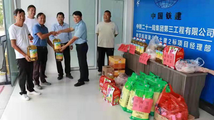 圖為項(xiàng)目部領(lǐng)導(dǎo)為一線施工人員送上慰問品