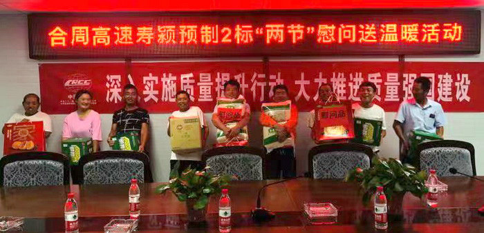 本網(wǎng)安徽阜陽 9月21日訊(通訊員 徐文娟)9月20日,中秋、國(guó)慶佳節(jié)將至,中鐵二十一局三公司合周高速壽潁預(yù)制02標(biāo)開展“迎雙節(jié)送溫暖 ”慰問活動(dòng),項(xiàng)目部為勞務(wù)隊(duì)工人送上了月餅、大米、大肉、食用油等慰問品和節(jié)日問候,讓深處他鄉(xiāng)的工人們深切感受到家人般濃濃的關(guān)愛之情,使大家備受鼓舞,同時(shí)也增強(qiáng)了項(xiàng)目的凝聚力和向心力。