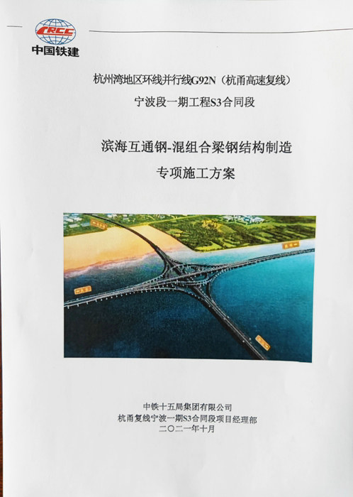 濱?;ネ屑~,是亞洲最大的海上立交,引起浙江省、寧波市和集團(tuán)公司各級(jí)領(lǐng)導(dǎo)的高度關(guān)注。編寫互通專項(xiàng)施工方案是干好工程的重要前提。項(xiàng)目部在7月份出臺(tái)長達(dá)299頁的濱?;ネ▽?shí)施性施工組織設(shè)計(jì)基礎(chǔ)上,再次指定專人編寫鋼混組合梁制造專項(xiàng)施工方案。鋼結(jié)構(gòu)部分制作、拼裝、涂裝層等工藝復(fù)雜,施工質(zhì)量、過程控制、檢驗(yàn)等必須滿足設(shè)計(jì)文件和標(biāo)準(zhǔn)規(guī)范要求。編制人員查閱資料、仔細(xì)解讀圖紙,對鋼混組合梁有足夠的認(rèn)識(shí)。編,依據(jù)國家、省、市34個(gè)規(guī)范標(biāo)準(zhǔn),14部國家法律、條例、辦法和66份規(guī)范性文件進(jìn)行編寫。