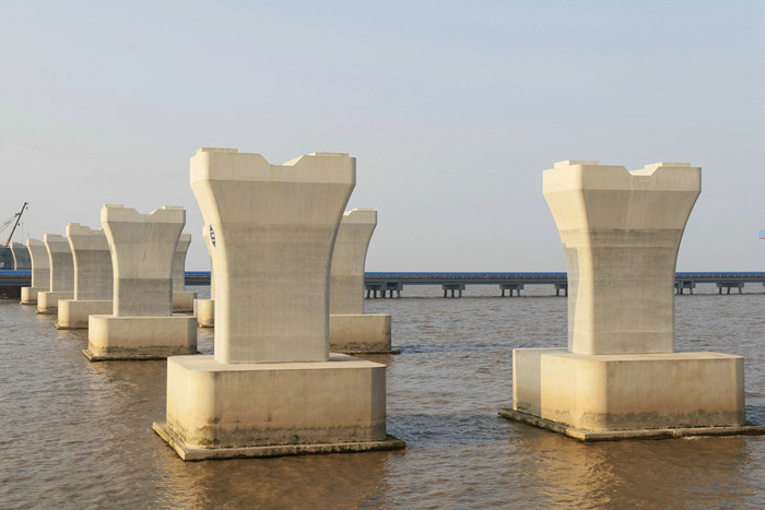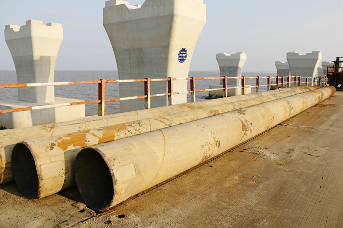 濱海高架橋主線長(zhǎng)6900米,上部結(jié)構(gòu)采用8孔40米+77孔50米預(yù)制架設(shè)箱梁+77.5+135+77.5連續(xù)梁。下部結(jié)構(gòu)為鉆孔樁+承臺(tái)+花瓶墩,橋梁跨越擬建和在建的排污管道、原油管道、給誰(shuí)通道、取水盾構(gòu)隧道、LNG管線和通信光纜。為滿足施工需要,濱海高架橋設(shè)計(jì)高6米、長(zhǎng)6900米、寬8米的棧橋,棧橋是施工必不可少的附屬工程,沒(méi)有棧橋的存在,便無(wú)法完成各項(xiàng)施工任務(wù)。棧橋是租賃一家單位的,每平米1天的租金是23.7元,僅高架橋的棧橋,每天的租金高達(dá)163530元。為便于樁基、底板、承臺(tái)、墩身24小時(shí)作業(yè),濱海高架橋還架設(shè)了上百座作業(yè)平臺(tái)。隨著濱海高架橋主體施工進(jìn)入后期階段,作業(yè)平臺(tái)和大部分鋼棧橋的使命已經(jīng)完成,今年以來(lái)陸續(xù)將上百座平臺(tái)拆除,拆除主線棧橋也勢(shì)在必行。