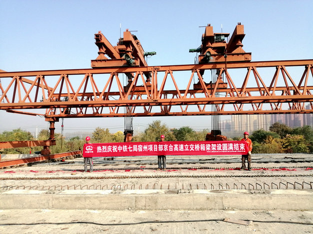 宿州市G343宿城至淮北界改建工程東起于拂曉大道與銀河一路交叉路口,向西延伸,與西外環(huán)路相交后,利用既有S303至終點,道路設(shè)計等級為一級公路兼城市道路功能,設(shè)計速度60Km/h,正線全長7.721Km;全線共設(shè)1座大橋、2座小橋和1座中橋,分別為京臺高速立交橋、三八溝支流一橋、三八溝支流二橋、薛堂溝中橋。其中,京臺高速立交橋是全線重點工程,項目部嚴(yán)格落實施工方案,全面加強工程安全、質(zhì)量、進(jìn)度管理,分別安排專人督促現(xiàn)場架設(shè)和梁場制、運梁工作,嚴(yán)格把控生產(chǎn)過程中的關(guān)鍵環(huán)節(jié),確保了箱梁架設(shè)任務(wù)安全、高效的完成。