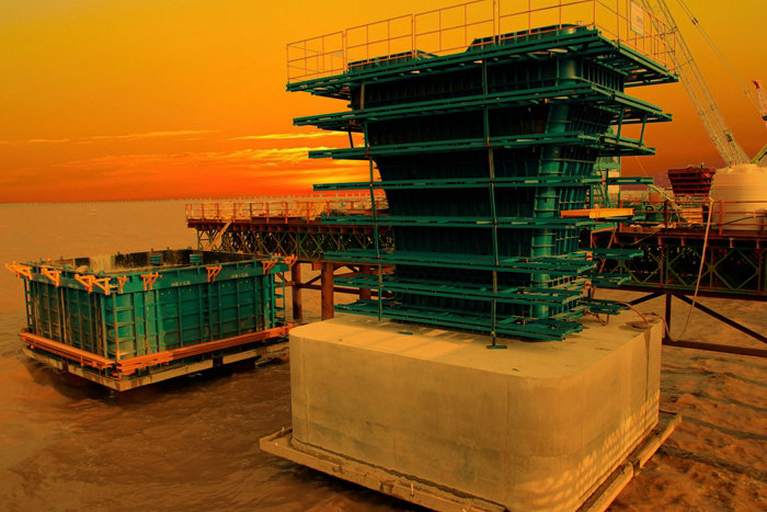 該公司承建的杭甬復(fù)線濱海高架橋和亞洲最大的海上互通濱海樞紐,全長14.9公里,設(shè)計樁基總量1745根172225延米,最長樁111.4米,最短樁74米,樁徑1.8—2.5米。橋梁承臺348座,大多數(shù)為矩形狀,少量為H型,主線和匝道均為高樁承臺,金塘拼寬橋為埋設(shè)承臺。兩座橋墩身810座,其中主線橋墩和拼寬橋為片式花瓶墩,8座匝道橋為圓柱墩+系梁,墩身設(shè)計634座,最高墩25.25米,最低6米,鋼混組合梁230孔,混凝土總量68.2萬立方,鋼筋7.265萬噸,鋼箱梁2.4萬噸,最重單塊梁體1700多噸。該標段暫定合同金額21.547億元。2018年8月8日簽訂下部結(jié)構(gòu)合同,2019年8月正式開工。