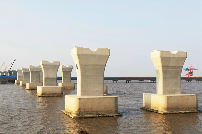 濱海高架橋主線長6900米,上部結(jié)構(gòu)采用8孔40米+77孔50米預(yù)制架設(shè)箱梁+77.5+135+77.5連續(xù)梁。下部結(jié)構(gòu)為鉆孔樁+承臺(tái)+花瓶墩,橋梁跨越擬建和在建的排污管道、原油管道、給水通道、取水盾構(gòu)隧道、LNG管線和通信光纜。為滿足施工需要,濱海高架橋設(shè)計(jì)高6米、長6900米、寬8米的棧橋,棧橋是施工必不可少的附屬工程,沒有棧橋的存在,便無法完成各項(xiàng)施工任務(wù)。棧橋是租賃一家單位的,每平米1天的租金是23.7元,僅高架橋的棧橋,每天的租金高達(dá)163530元。為便于樁基、底板、承臺(tái)、墩身24小時(shí)作業(yè),濱海高架橋還架設(shè)了上百座作業(yè)平臺(tái)。隨著濱海高架橋主體施工進(jìn)入后期階段,作業(yè)平臺(tái)和大部分鋼棧橋的使命已經(jīng)完成,今年以來陸續(xù)將上百座平臺(tái)拆除,拆除濱海高架橋棧橋也勢在必行。