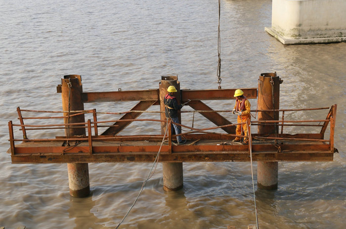 為此,從今年9月份起,該項(xiàng)目部組織棧橋隊(duì)進(jìn)行破拆濱海高架28—53墩位置的1200米鋼棧橋,因部分墩身尚未移交,目前只拆除550米,現(xiàn)已拆除46跨棧橋。在拆除過程中,該項(xiàng)目部嚴(yán)格按照高空、水上作業(yè)安全操作規(guī)程做好安全工作,由專職安全員全程跟蹤,規(guī)范作業(yè)人員的行為,對(duì)履帶吊司機(jī)和參與破拆的電焊工,堅(jiān)持做到崗前警示、施工中檢查指導(dǎo),發(fā)現(xiàn)嫌麻煩不拴保險(xiǎn)繩者,立即糾正,事后提出嚴(yán)厲批評(píng),堅(jiān)決杜絕類似不安全苗頭的發(fā)生。