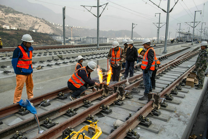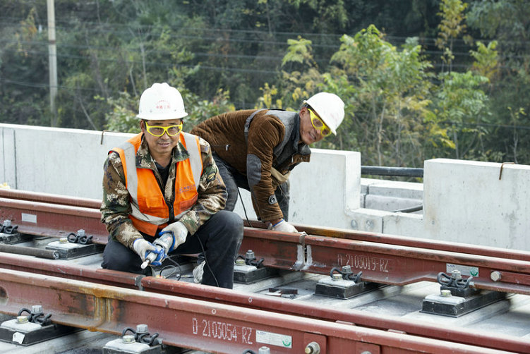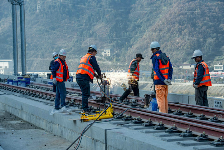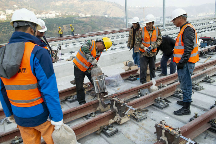 鄭萬(wàn)高鐵鐵路鋼軌無(wú)縫焊接施工正在有序推進(jìn)-興山車站鋁熱焊施工人員作業(yè)中