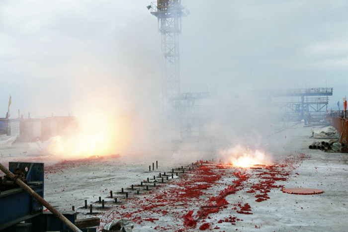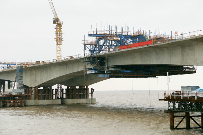 杭甬項目濱海高架橋懸空連續(xù)梁主跨135米,兩端副跨各77.5米,全長290米,橫跨海底直徑4.5米的輸油管道,是濱海高架橋的節(jié)點,也是全線的重難點工程。橋梁起點樁號為K35+240,終點樁號為K35+530,施工難度大、安全風(fēng)險高,在施工過程中,若鋼模等重物在吊運過程中,不慎從吊鉤上脫落,由幾十米高空墜海砸中輸油管道,必然會造成管壁破裂,原油外泄,使海水出現(xiàn)嚴(yán)重污染,后果不堪設(shè)想,不敢有絲毫馬虎,要時刻蹦緊安全之弦。出于安全考慮,該項目部請寧波市海事局蛙人摸排原油管道并標(biāo)出準(zhǔn)確位置,在棧橋和連續(xù)梁施工中避免誤踩“雷區(qū)”。同時組織技術(shù)人員熟悉圖紙、反復(fù)調(diào)研論證復(fù)雜的海底地質(zhì),掌握詳實、精確的第一手資料,再由工程部專人編寫施工方案。有關(guān)人員不分白晝加班加點奮戰(zhàn)數(shù)日,長達169頁的《濱海高架橋連續(xù)梁施工方案》初稿出籠,然后召集“智囊團”成員討論、修改方案,后經(jīng)專家組審定,正式組織實施。