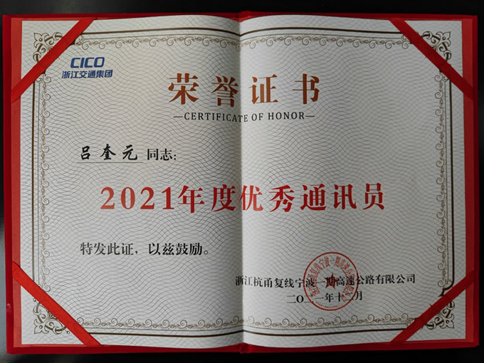 寧波市高等級(jí)公路建設(shè)管理中心在全市高速公路建設(shè)領(lǐng)域開(kāi)展評(píng)選2021年度優(yōu)秀通訊員活動(dòng),此次共評(píng)選出21名優(yōu)秀通訊員,呂奎元是杭甬復(fù)線一期5個(gè)標(biāo)段唯一獲獎(jiǎng)的個(gè)人。由業(yè)主組織評(píng)選的杭甬復(fù)線2021年度信息宣傳工作先進(jìn)集體和優(yōu)秀通訊員,共有3個(gè)集體和10名個(gè)人獲獎(jiǎng)。他熱愛(ài)新聞宣傳工作,采寫(xiě)新聞的過(guò)程中,將多年積累的知識(shí)、情感、經(jīng)驗(yàn)全部釋放出來(lái)。他經(jīng)常深入施工現(xiàn)場(chǎng)拍照、與施工人員交流,采寫(xiě)出許多有深度、含金量高的新聞,2021年在浙江日?qǐng)?bào)、寧波日?qǐng)?bào)、股份公司網(wǎng)站等多家媒體發(fā)表消息、通訊1100余篇。
