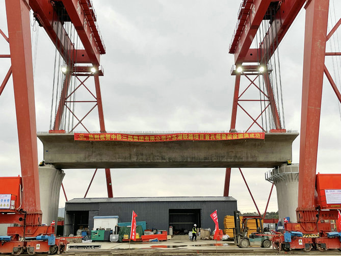 12月25日,隨著提梁機將一榀32米長雙線箱梁成功架設在東苕溪特大橋33—32#墩上,順利完成了首榀箱梁架設任務,標志著中鐵三局滬蘇湖項目正式邁入架梁施工階段,滬蘇湖鐵路建設將再次提速。
