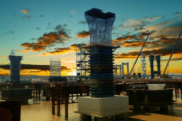 該項目部由于調(diào)動了各方面積極因素,全年施工生產(chǎn)取得好成績:濱?;ネㄈ骈_工,規(guī)模顯現(xiàn),濱海高架安全通過17條海底管線,跨海底直徑4.5米輸油管道連續(xù)梁于12月15日成功合攏,濱?;ネㄌ崆?天架設(shè)第一片鋼箱梁,搭設(shè)鋼棧橋5232米,完成樁基835根、承臺245座、墩身274座。完成施工產(chǎn)值與2020年7.0629億元產(chǎn)值相比,超額11.95%,