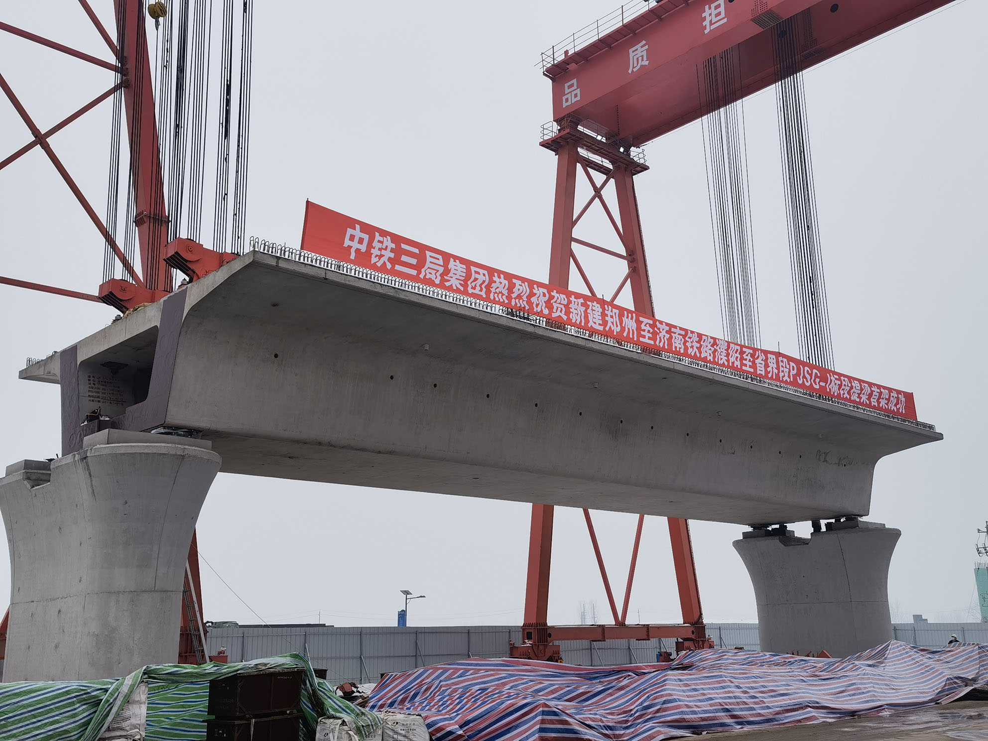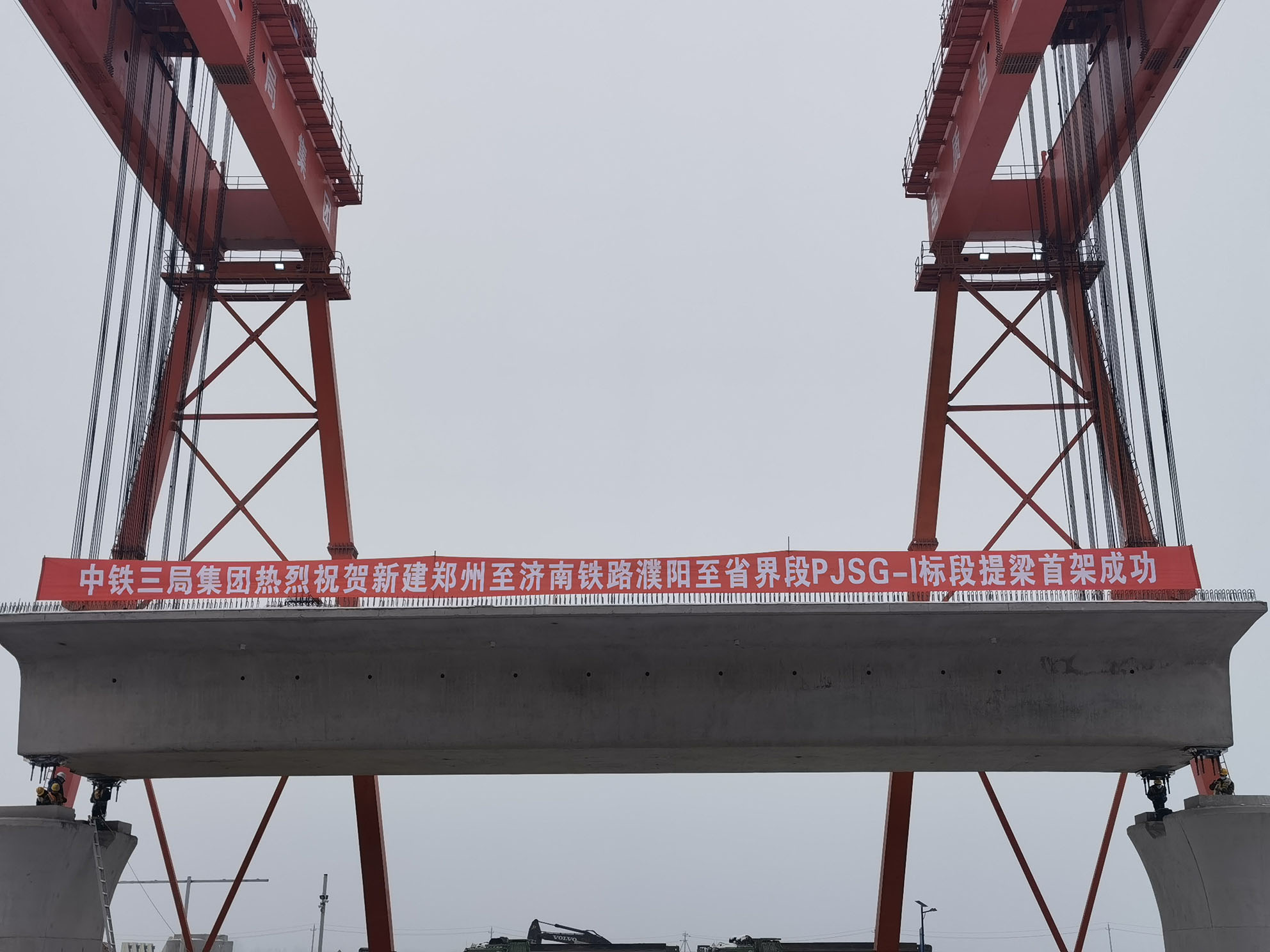 1月24日上午9點18分,隨著2臺DGM450提梁機把一榀32米箱梁穩(wěn)穩(wěn)的落在175#—174#墩上,標(biāo)志著濟鄭鐵路濮陽至省界段施工開始由線下工程轉(zhuǎn)入線下、線上工程同時進行,鄭濟高鐵建設(shè)進入全面提速階段。