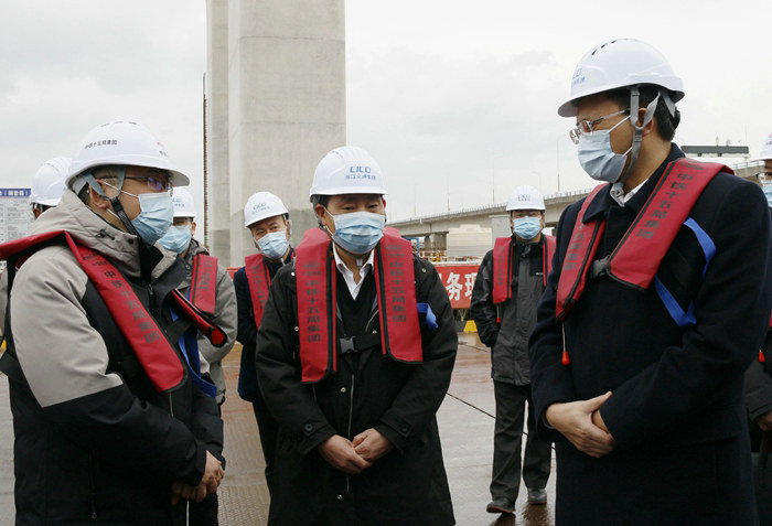 上午10點40分,邵文年一行來到杭甬項目濱?;ネㄖ行膮^(qū)域,首先查看了棧橋、承臺和墩身施工場面。隨后,項目黨支部副書記(主持工作)彭勇代表項目部匯報了春節(jié)期間不停工、125名員工留守工地、隊伍管理、工期、產值、安全、疫情防控,以及2月9日全面復工復產等情況。邵文年對該項目近期的工作給予充分肯定,他指出:“中鐵十五局堅持節(jié)日施工,年后復工復產動作快,工期意識、履約意識很強,我感到高興。”針對濱?;ネㄊ┕みM展情況和浙江省不容樂觀的新冠疫情形勢,他提出4點要求:一是抓進度。年底完成架梁目標,任務還很重,不能有松懈情緒和自滿自足思想,近幾天人員到齊了,要馬上掀起施工大干高潮,產值論英雄,月月完成計劃,后期沒壓力。二是繼續(xù)做好新冠疫情防控工作,這是當前和今后一個時期的工作重點,措施要到位,執(zhí)行要鐵面無私,員工的健康是頭等大事,疏忽大意會造成無法挽回的損失,誰也擔不起這個責任。三是抓施工安全要戒驕戒躁,要常思不講安全的危害,常敲事故警鐘,安全工作要天天抓、月月抓,不能有厭倦情緒,在項目沒干完之前,要時刻增強安全就是效益、就是信譽的意識。四是多開展一些活動,調動員工的積極性、主動性,將全員的思想統(tǒng)一到干好工程上來。