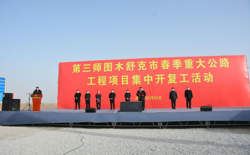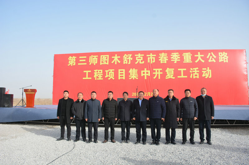圖木舒克訊(通訊員 梁毅)2月22日,第三師圖木舒克市交通運輸局2022年春季重大公路建設(shè)項目開復(fù)工儀式在圖昆公路第一合同段舉行。這標志著備受社會各界關(guān)注的第三師圖木舒克市—第十四師昆玉市公路項目(第三師段)正式開工建設(shè)。