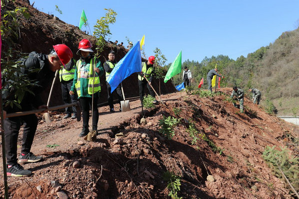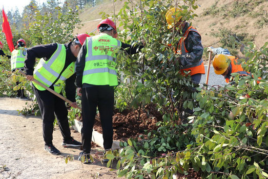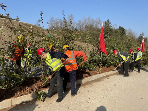 項(xiàng)目部積極組織動(dòng)員,廣大黨員、團(tuán)員青年踴躍參與,自覺(jué)履行法定植樹(shù)義務(wù),高舉鮮紅的黨旗團(tuán)旗,肩扛鐵鍬、鋤頭,在黨支部書(shū)記杜強(qiáng)的帶領(lǐng)下,邁著整齊的步伐,來(lái)到植樹(shù)的山坡、路邊、溝旁,參加義務(wù)植樹(shù)造林活動(dòng)。大家在植樹(shù)過(guò)程中,三五一組,互相分工,密切配合,挖坑的挖坑,填土的填土,為了保證樹(shù)苗成活率,澆水的澆水,整個(gè)植樹(shù)場(chǎng)面干勁十足,熱火朝天,盡管驚蟄季節(jié)天氣轉(zhuǎn)暖,臉上冒著汗水,絲毫沒(méi)有影響植樹(shù)的勁頭,在大家的共同努力下,經(jīng)過(guò)近三個(gè)小時(shí)的勞動(dòng)共植香樟樹(shù)280余棵樹(shù)苗。