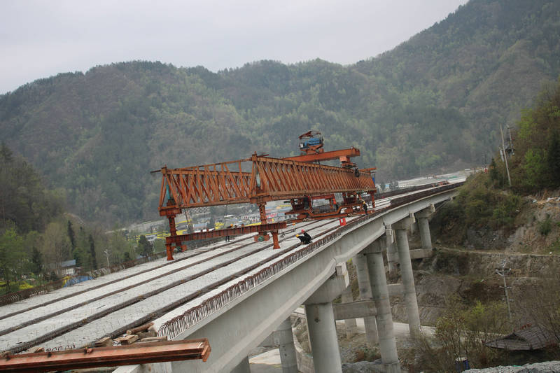 青川訊(通訊員 劉英華) 3月18日11時(shí),在廣平高速TJ06合同段三清觀大橋施工現(xiàn)場,隨著最后一片長40米T梁、 124.7噸重的T梁緩緩平移至大橋右幅橋墩蓋墊石支座上,在場工人一片歡呼,該橋梁右幅順利貫通。