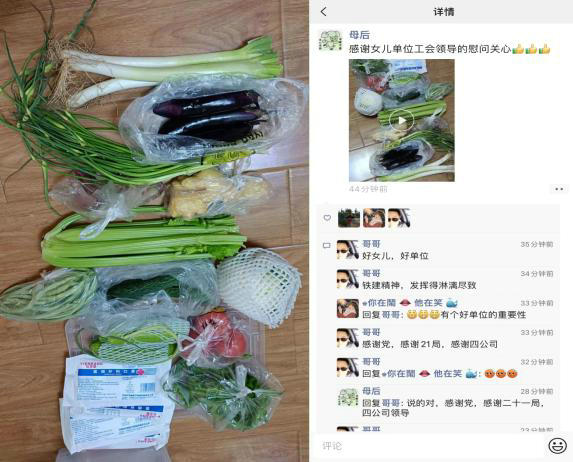 有職工說:“咱們公司真貼心,昨晚九點多我還接到了工會打來的電話,說給家里送了箱菜,我媽取上菜還給我打了電話說感謝公司,疫情期間出門也不方便,咱們工作人員這么晚了還給家里送來這么多蔬菜,一下子為我們解決了大麻煩了。”