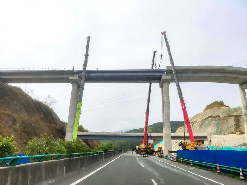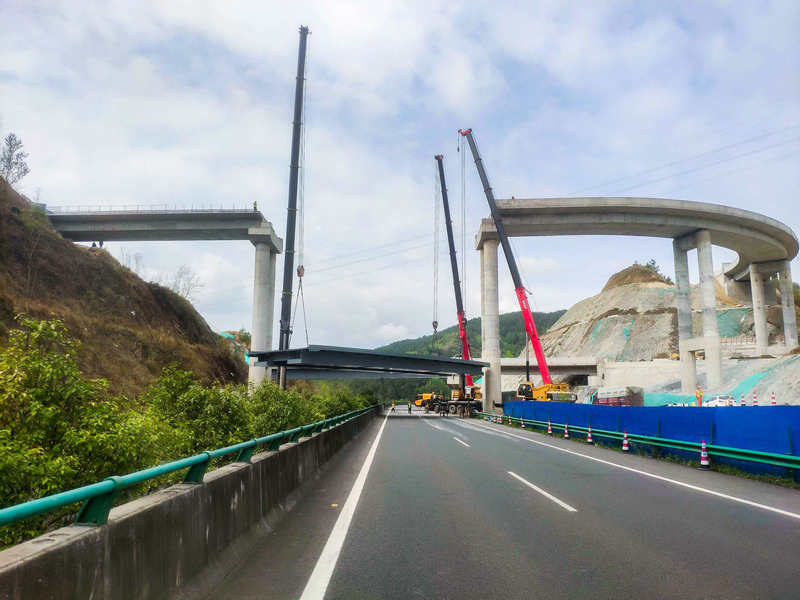 此次鋼箱梁架設需上跨蘭海高速(廣甘段)主干道施工,時間緊、任務重,梁體垂直提升高度近30米,是該項目最后一處“危大”工程。為確保箱梁安全精準架設,該項目成立攻堅團隊,深入現(xiàn)場調(diào)查研究,多次組織召開專題會議,優(yōu)化吊裝方案,認真做好施工前的技術(shù)交底,使作業(yè)人員能熟練掌握技術(shù)規(guī)程和操作規(guī)范。同時,搶抓作業(yè)有利窗口期,將蘭海高速(廣甘段)道路車輛分流至在建廣平高速匝道繞行,采用3臺吊車同時協(xié)作施工,經(jīng)過11個小時的緊張作業(yè),“落梁”作業(yè)圓滿完成。