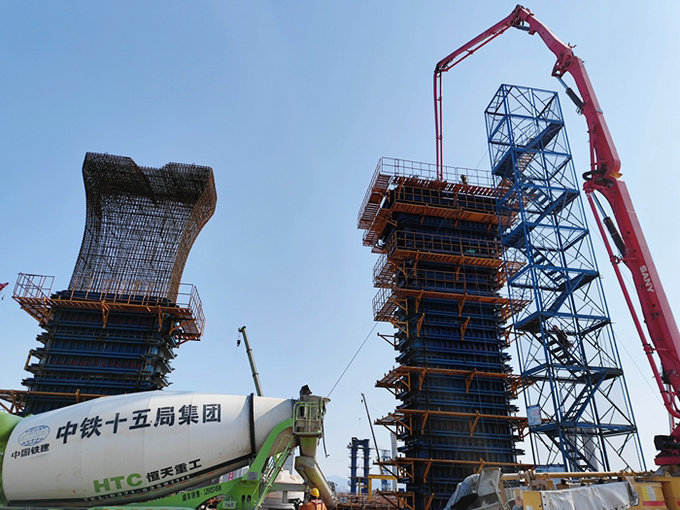 濱?;ネㄊ莵喼拮畲蟮暮I匣ネ?,共設(shè)8座匝道橋,分內(nèi)環(huán)和外環(huán),其中3座上跨、4座下穿金塘大橋,直徑1.8米—2.5米的樁基1027根,平均長(zhǎng)度83米。C匝道為外環(huán),樁基34根、F匝道設(shè)在內(nèi)環(huán),樁基83根,一部分走向并行,在匝道橋中相互作用。去年隆冬先后開工的C、F匝道樁基,地處淺海水域,地質(zhì)結(jié)構(gòu)復(fù)雜,在插打鋼護(hù)筒、泥漿反循環(huán)鉆孔過程中遭遇堅(jiān)硬的泥巖和砂巖,進(jìn)度受阻,該項(xiàng)目部采取由50多噸的液壓振動(dòng)錘變?yōu)?20噸的液壓振動(dòng)錘,以超強(qiáng)振動(dòng)力,強(qiáng)行將鋼護(hù)筒振插到83米深處,為鉆孔創(chuàng)造條件。在泥漿反循環(huán)鉆孔作業(yè)中,與泥巖和砂巖相遇,鉆孔十分困難,采取勤換鉆頭、將鉆頭“牙齒”打磨鋒利等多種辦法攻克了鉆孔難題。