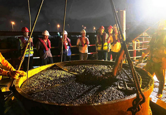 濱?;ネ⒔辉O(shè)計樁基1033根,去年變更后為 1027根,插入海底的樁基直徑1.8—2.5米、深度平均83米。D匝道位于濱?;ネ▋?nèi)環(huán)區(qū)域,畫了一個圓圈,與幾條匝道縱橫交錯。H匝道在濱?;ネㄍ猸h(huán),與著名的寧波—舟山跨海21000米的金塘大橋相接。D、H匝道橋設(shè)計樁基81根,其中H匝道樁基是8條匝道中最少的。今年春節(jié)前,全長4510米的濱海高架橋、主跨135米的連續(xù)梁主體工程相繼完工,之后該項目部將施工重點集中在濱?;ネ?,采取鋼棧橋架設(shè)與主線橋和匝道橋樁基、承臺、墩身全面推進(jìn)的施工策略,打好2022年關(guān)鍵之年攻堅戰(zhàn)。樁基施工是橋墩作業(yè)的第一道工序,也是第一道關(guān),不能有絲毫馬虎。振插鋼護(hù)筒時,在技術(shù)人員指導(dǎo)下進(jìn)行,做到不偏不倚,以泰山壓頂、排山倒海之勢,將一根根焊接成83米的鋼護(hù)筒,一點一點地往下插。由于海底結(jié)構(gòu)復(fù)雜,地質(zhì)不確定因素多,常遇到堅硬的泥巖、砂巖,此時馬上啟用大功率、振插力達(dá)到上百噸的振動錘,在履帶吊的配合下進(jìn)行作業(yè),直至將鋼護(hù)筒插到位。在后續(xù)鉆孔泥漿反循環(huán)和吊裝鋼筋籠作業(yè)時,吊車和人力通力合作,掏空鋼護(hù)筒內(nèi)的泥漿后,將鋼筋籠穩(wěn)穩(wěn)地下到海底深處。灌樁時間大部分是晚上,由幾名技術(shù)員在場指導(dǎo)施工,在監(jiān)理和業(yè)主單位工程師見證下順利完成。