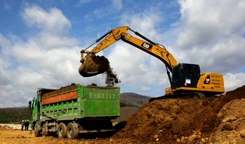 節(jié)日期間,管內(nèi)大營(yíng)村段路基施工拉開序幕。該段路基全長(zhǎng)1237米靠近村屯、鄰近山區(qū)、穿行基本農(nóng)田,且地勢(shì)起伏匯水點(diǎn)多、基底松軟加固CFG樁C組土換填、土質(zhì)復(fù)雜邊坡防護(hù)采用拱形骨架、混凝土肋柱。為了加快表土剝離速度,增設(shè)了兩臺(tái)推土機(jī)進(jìn)行分段平行作業(yè)。另一側(cè)的大型挖掘機(jī)高擎巨臂抓斗不停翻轉(zhuǎn)挖填作業(yè),10余臺(tái)自卸車往來穿梭搶運(yùn)土方,一段段路基雛形初現(xiàn)。他們?nèi)σ愿盃?zhēng)分奪秒與時(shí)間賽跑,快速完成表土外運(yùn),為路基試驗(yàn)段開辟施工場(chǎng)地。
