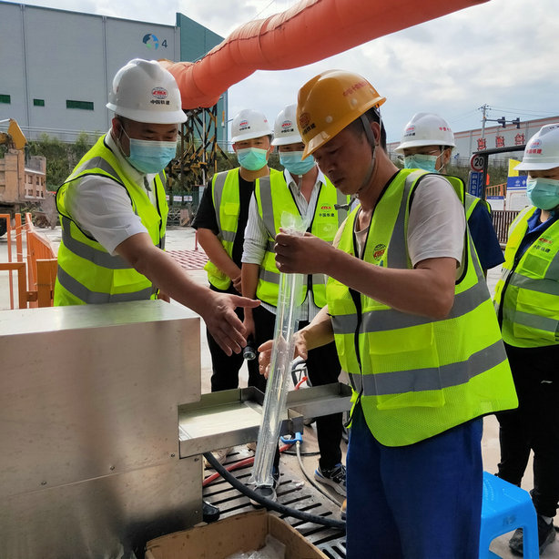 曹元均(左1)與技術(shù)人員在指導(dǎo)制作第三代水壓爆破水袋